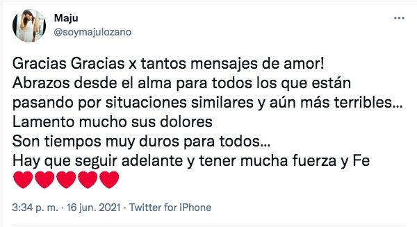 Luego, y tras la cantidad de mensajes recibidos, Maju manifestó su agradecimiento y solidaridad con aquellos que están pasando por lo mismo.