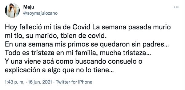 "Hoy falleció mi tía de coronavirus. La semana pasada murió mi tío, su marido, también por coronavirus. En una semana mis primos se quedaron sin padres… Todo es tristeza en mi familia, mucha tristeza… Y una viene acá como buscando consuelo o explicación a algo que no lo tiene", escribió la conductora de El Nueve en su cuenta oficial de Twitter.