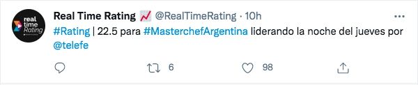 Luego de la histórica noche de audiencia que logró MasterChef Celebrity el día miércoles - logrando un pico de rating de 25.7 -, el certamen culinario de Telefe volvió a liderar la noche del jueves con una audiencia máxima de 22.5 puntos de rating.