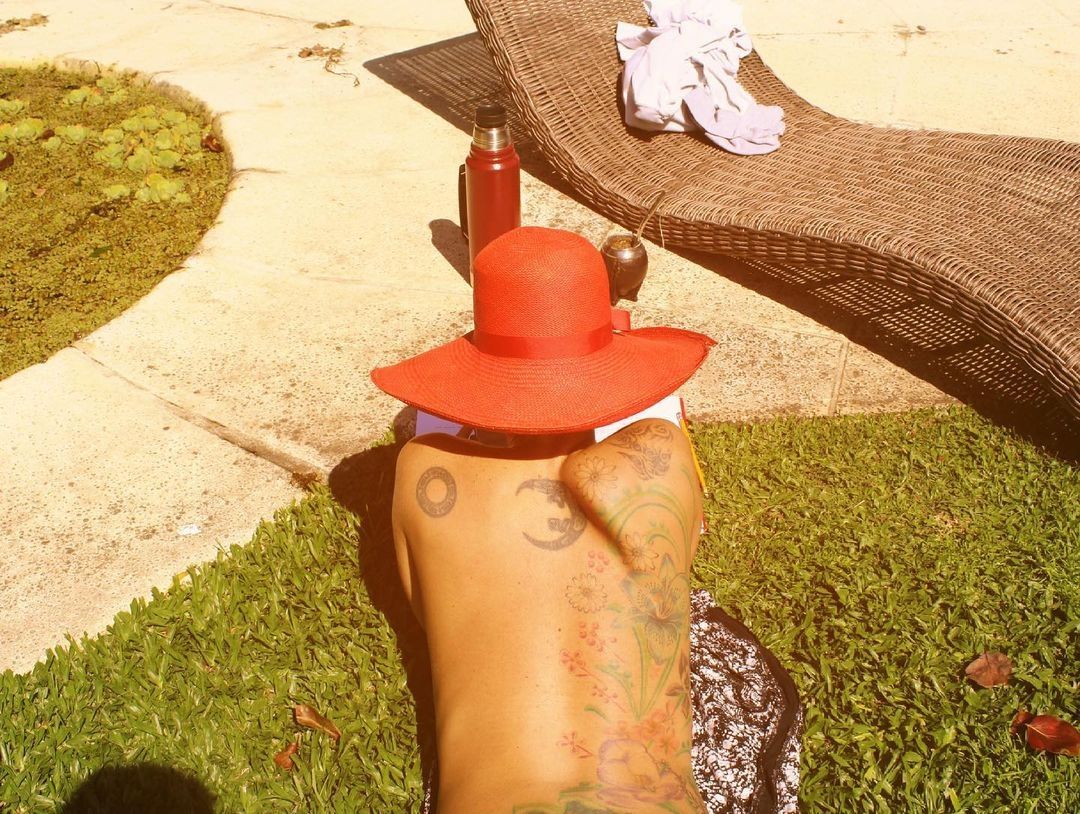 Con un sombrero rojo, recostada sobre el césped, la nieta de Mirtha Legrand fue captada con un equipo de mate muy cerca de lla y leyendo un libro. Sin traje de baño y con su espalda totalemente descubierta para lucir los diseños que tiene tatuados en su piel.