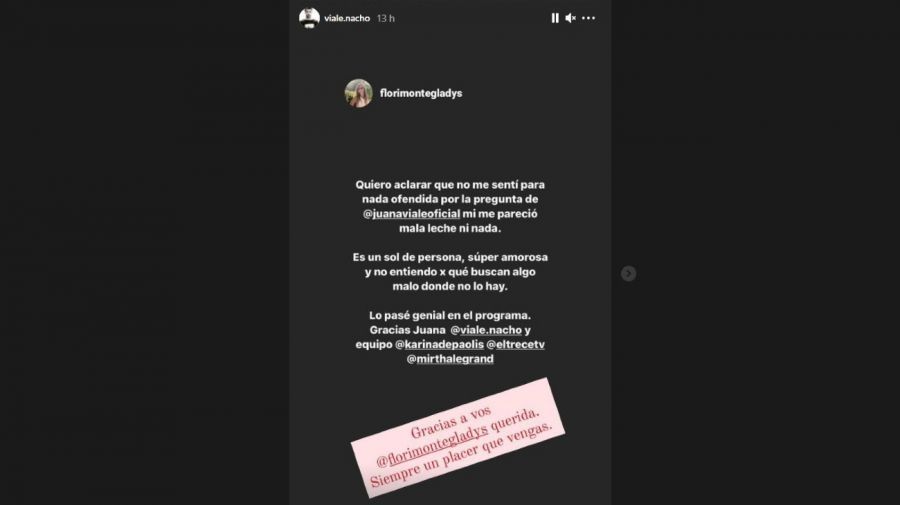 Tras la repercusión del crispado momento, Gladys Florimonte compartió un categórico mensaje en la red. "Quiero aclarar que no me sentí para nada ofendida por la pregunta de Juana Viale, ni me pareció mala leche ni nada". Luego definió a la conductora como "un sol de persona, súper amorosa". Y aseguró no entender "por qué buscan algo malo donde no lo hay".