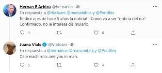 Arbizu continuó adjuntando una noticia que muestra que hace cinco años Francisco hizo una serie de acciones por los refugiados. “Es buenísima, la noticia del día”, respondió Viale. “Te dice que es de hace 5 años la noticia, ¿cómo va a ser ‘noticia del día’? Confirmado, no le interesa disimularlo”, remató el exbanquero. Viale finalizó con un lapidario: “Dale machirulo. See you in Mars (nos vemos en Marte)”.