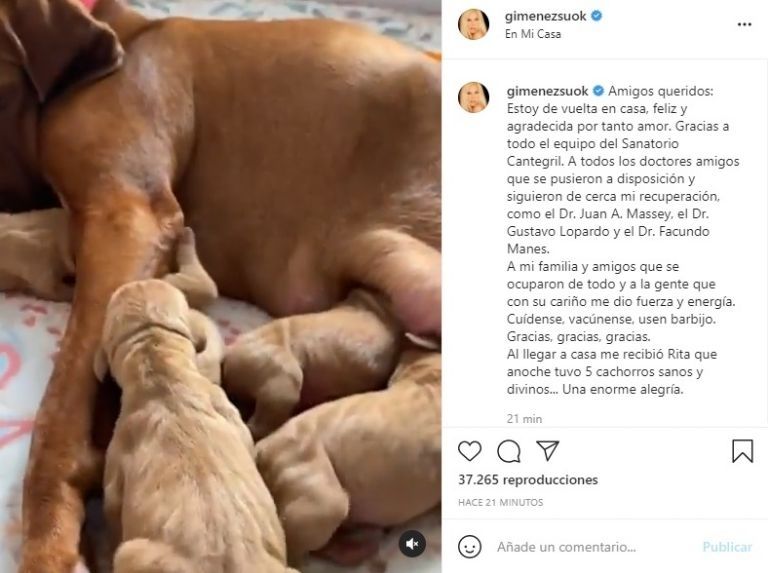 "A mi familia y amigos que se ocuparon de todo y a la gente que con su cariño me dio fuerza y energía. Cuídense, vacúnense, usen barbijo. Gracias, gracias, gracias. Al llegar a casa me recibió Rita que anoche tuvo 5 cachorros sanos y divinos. Una enorme alegría", concluyó.