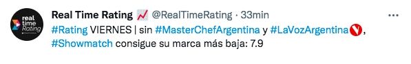 Anoche, Telefe y El Trece nuevamente se enfrentaron en materia de rating. El canal de las pelotas no tuvo al aire ni MasterChef Celebrity, que terminó el jueves, ni su nueva apuesta La Voz Argentina, que debutó luego de la gran final del certamen culinario. De esta forma, estaba todo dado para que ShowMatch hiciera diferencias en materia de audiencia. Pero no fue así. El programa conducido por Marcelo Tinelli consiguió una de sus marcas más bajas, 7.9 puntos de rating.