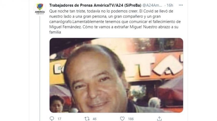 Por otro lado, los trabajadores de América TV, desde su cuenta oficial de Twitter fueron los encargados de dar la noticia: "Qué noche tan triste, todavía no lo podemos creer. El Covid se llevó de nuestro lado a una gran persona, un gran compañero y un gran camarógrafo. Lamentablemente tenemos que comunicar el fallecimiento de Miguel Fernández. Cómo te vamos a extrañar Migue! Nuestro abrazo a su familia", rezaba el mensaje en cuestión.