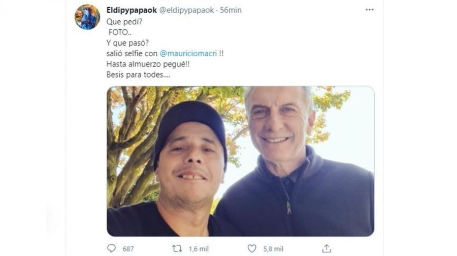 Finalmente, El Dipy y Mauricio Macri se tomaron una selfie. El encuentro se dio luego de que el cantante le propusiera al expresidente tomarse una foto para "ver reventar de bronca a los K", harto de que lo tilden de "macrista".