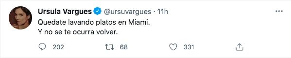 Luego siguió: "Andante a dónde mierda quieras estar. Pero a Argentina no entrás. Nos estamos sacando una horda de imbéciles en un Twitt. Deseo que no vuelvas al país. Quedate lavando platos en Miami. Y no se te ocurra volver".