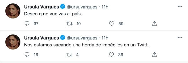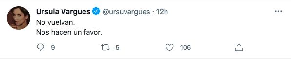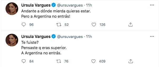 Desde sus redes sociales, Úrsula Vargues opinó sobre quienes están afuera y no pueden volver debido a las restricciones implementadas por el gobierno Nacional. "¿Te fuiste? ¿Pensaste que eras superior? A Argentina no entrás", sentenció en Twitter.