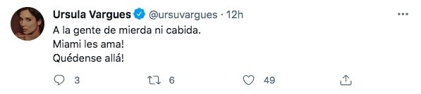 Además, también disparó contra la panelista de LAM: "Exigen volver a un país que odian, porque en Miami son pobres. Al fin una imbécil que se creía mil no puede volver. El cornude es muy de ir a Miami. Y tu marido es un boludo. Pobre mina. Se hace la canchera y no tiene apellido sin su marido. Nadie necesita a la cornuda. A la gente de mierda ni cabida. Miami les ama. Quédense allá".