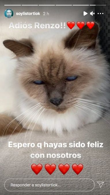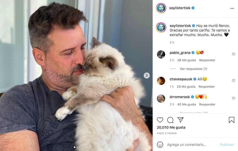 "Hoy se murió Renzo. Gracias por tanto cariño. Te vamos a extrañar mucho. Mucho. Mucho", escribió el conductor y humoristas al subir dos imágenes con el felino.