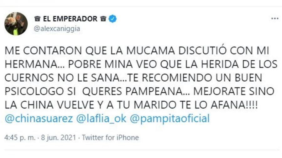 Y este martes en la tarde, para subir más el tono de la polémica, Alex Caniggia posteó un agresivo mensaje contra Ardohain. "Me contaron que la mucama discutió con mi hermana. Pobre mina, veo que la herida de los cuernos no le sana. Te recomiendo un buen psicólogo si querés, pampeana. Mejorate sino la China vuelve y a tu marido te lo afana!", lanzó el mediático sin piedad. Además, en la repudiable publicación arrobó las cuentas de Eugenia Suárez, Pampita y LaFlia.