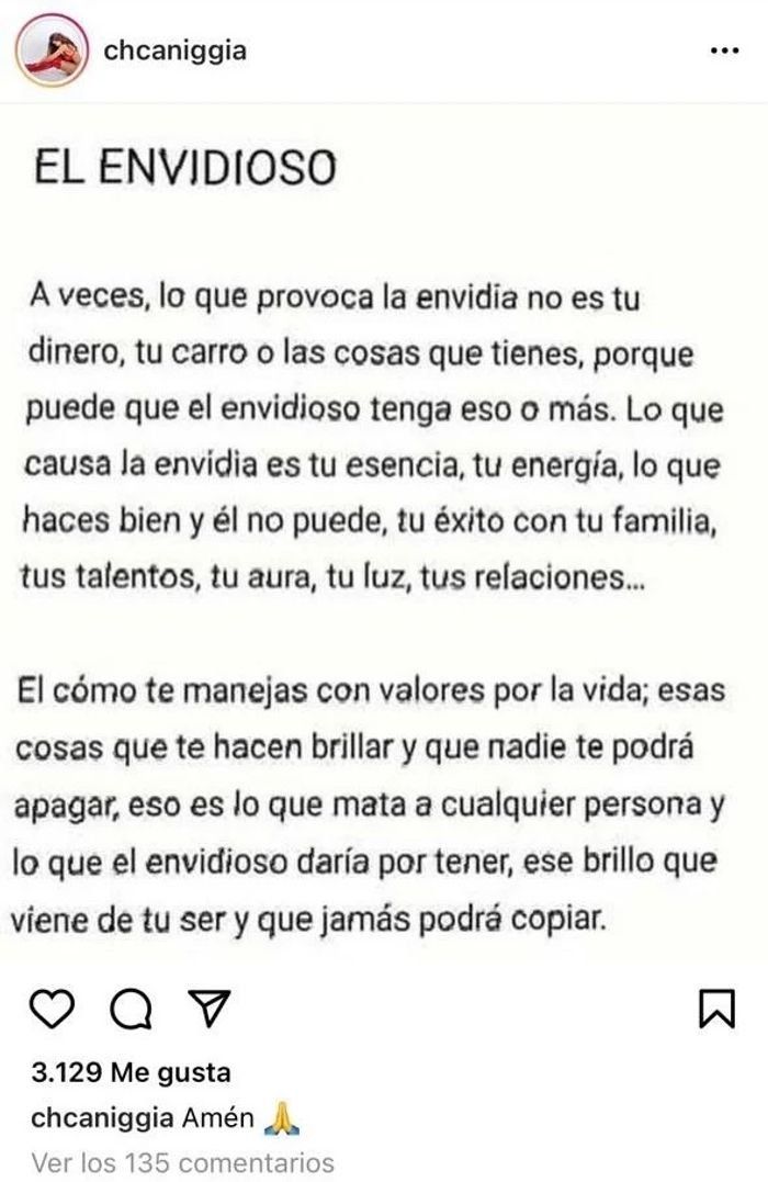 Sin nombrar a la modelo, la rubia disparó. "El envidioso. A veces lo que provoca la envidia no es tu dinero, tu carro o las cosas que tienes porque puede que el envidioso tenga eso o más. Lo que causa la envidia es tu esencia, tu energía, lo que haces bien y él no puede, tu éxito con la familia, tus talentos, tu aura, tu luz, tus relaciones. El cómo te manejas con valores por la vida, esas cosas que te hacen brillar y que nadie podrá apagar. Eso es lo que mata a cualquier persona y lo que el envidioso daría por tener, ese brillo que viene de tu ser y que nunca podrá copiar", posteó Charlotte.