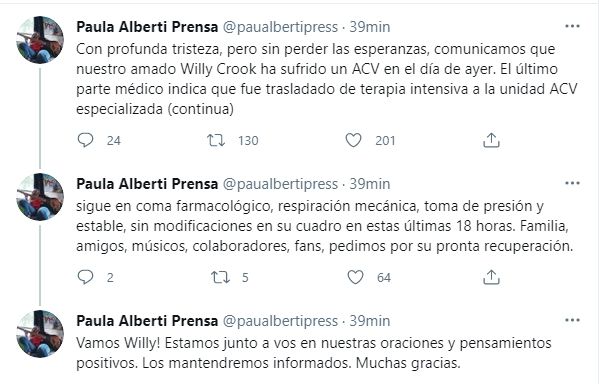 "Con profunda tristeza, pero sin perder las esperanzas, comunicamos que nuestro amado Willy Crook ha sufrido un ACV en el día de ayer. El último parte médico indica que fue trasladado de terapia intensiva a la unidad ACV especializada", comienza el comunicado publicado por Paula Alberti, encargada de la prensa del músico.