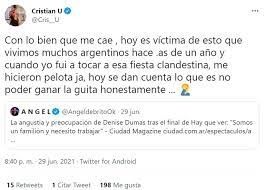 “Con lo bien que me cae, hoy es víctima de esto que vivimos muchos argentinos hace más de un año. Y cuando yo fui a tocar a esa fiesta clandestina, me hicieron pelota. Hoy se dan cuenta lo que es no poder ganar la guita honestamente”, comentó Cristian U a través de Twitter.