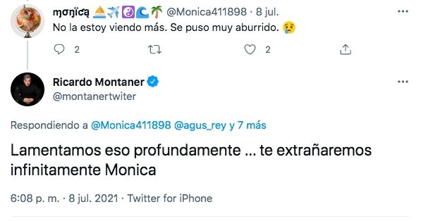 "No lo estoy viendo más. Se puso muy aburrido", le escribió una usuaria. A lo que Montaner respondió: "Lamentamos eso profundamente… te extrañaremos infinitamente Mónica".