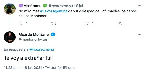 Luego, otra usuaria escribió un tuit criticando a los hijos del cantante: "No miro más ‘La Voz Argentina’. Debut y despedida. Infumables los nabos de los Montaner". "Te voy a extrañar full", ironizó.