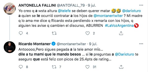 Otra usuaria aseguró que la inclusión de los hermanos habría caído mal entre el público: "Yo creo que a esta altura en Telefe se deben querer matar. ¿A quién se le ocurrió contratar a los hijos de Montaner? Mi madre, que lo ama, me dice que Ricardo está perdiendo por remarla con los hijos. Que alguien les avise que cambien el discurso. ABURREN".