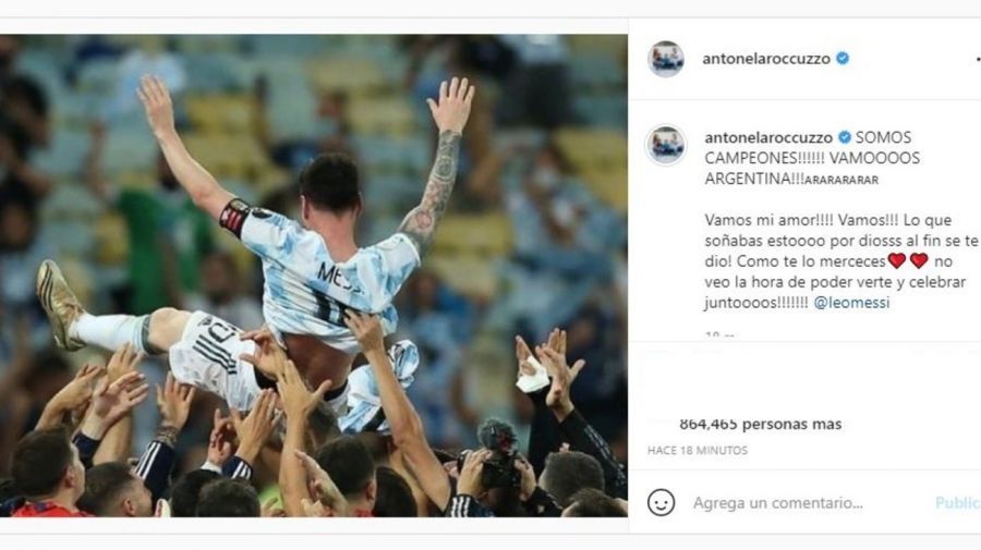 "¡¡¡SOMOS CAMPEONES!!! ¡¡VAMOOOOS ARGENTINA!!", exclamó Roccuzzo. Y luego, dirigiéndose cariñosamente a Messi agregó: ¡¡¡Vamos mi amor!!! ¡¡¡Vamos!!! ¡¡Lo que soñabas estoooo por Diosss al fin se te dio! ¡¡¡Como te lo merecés no veo la hora de poder verte y celebrar juntoooos!!!!!!! @leomessi".