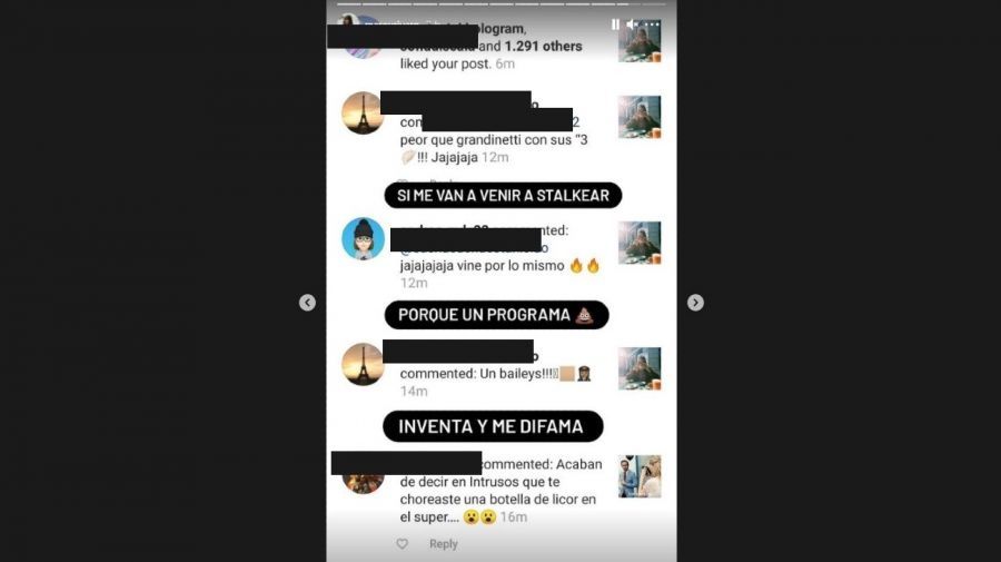 Marou compartió algunos comentarios que le llegaron a su cuenta de Instagram, y comentó categórica: "Si me van a venir a stalkear porque un programa mierd* inventa y me difama...", exponiendo a quienes algunos usuarios que la agredieron.