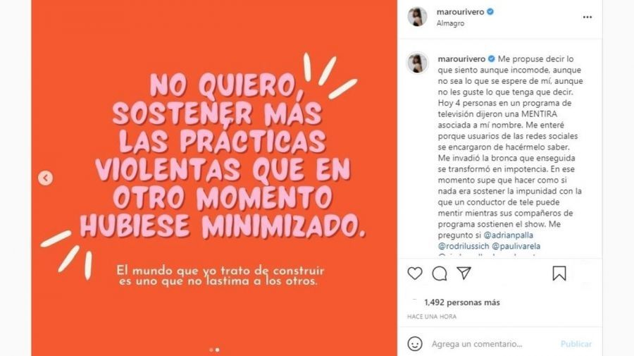 Pero el asunto no terminó ahí, luego Rivero hizo un fulminante descargo a través de un posteo en el que se encargó de aclarar los tantos. "Me propuse decir lo que siento aunque incomode, aunque no sea lo que se espere de mí, aunque no les guste lo que tenga que decir. Hoy cuatro personas en un programa de televisión dijeron una MENTIRA asociada a mí nombre. Me enteré porque usuarios de las redes sociales se encargaron de hacérmelo saber", comenzó.