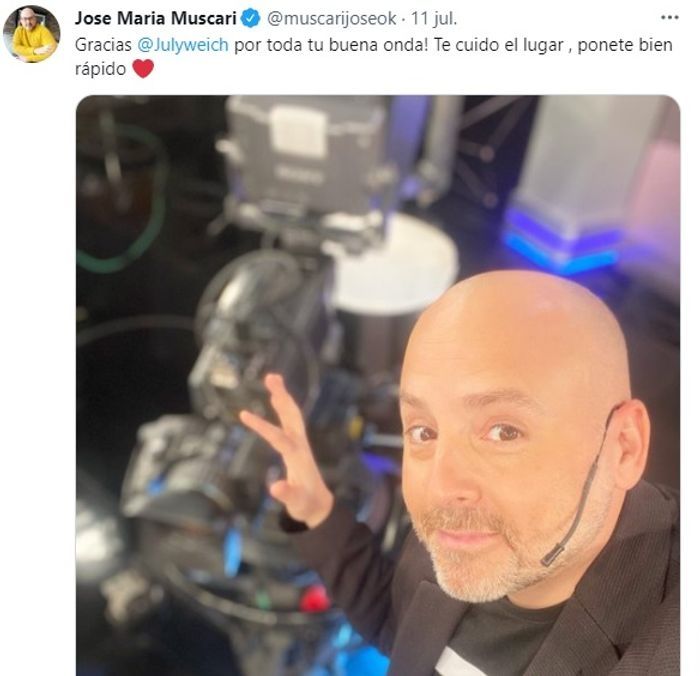Por esa razón, este fin de semana su rol fue realizado por José María Muscari, que se manifestó en las redes, donde escribió un emotivo mensaje dándole fuerza a Julián. "Gracias @Julyweich por toda tu buena onda. Te cuido el lugar, ponete bien rápido", indicó en sus redes sociales.