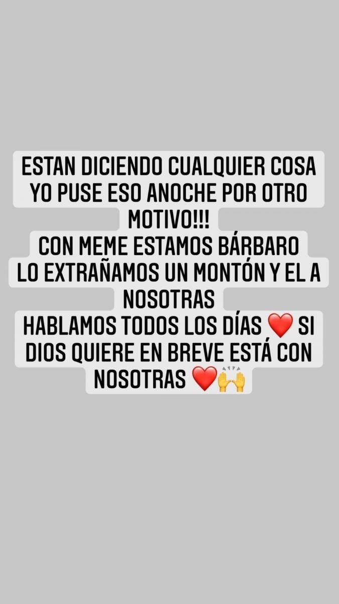 Luego, a través de sus stories de Instagram, María del Cerro cerró la polémica con un descargo categórico: “Están diciendo cualquier cosa, yo puse eso anoche por otro motivo. Con Meme estamos bárbaro. Lo extrañamos un montón; y él a nosotras. Hablamos todos los días. Si Dios quiere en breve está con nosotras”.