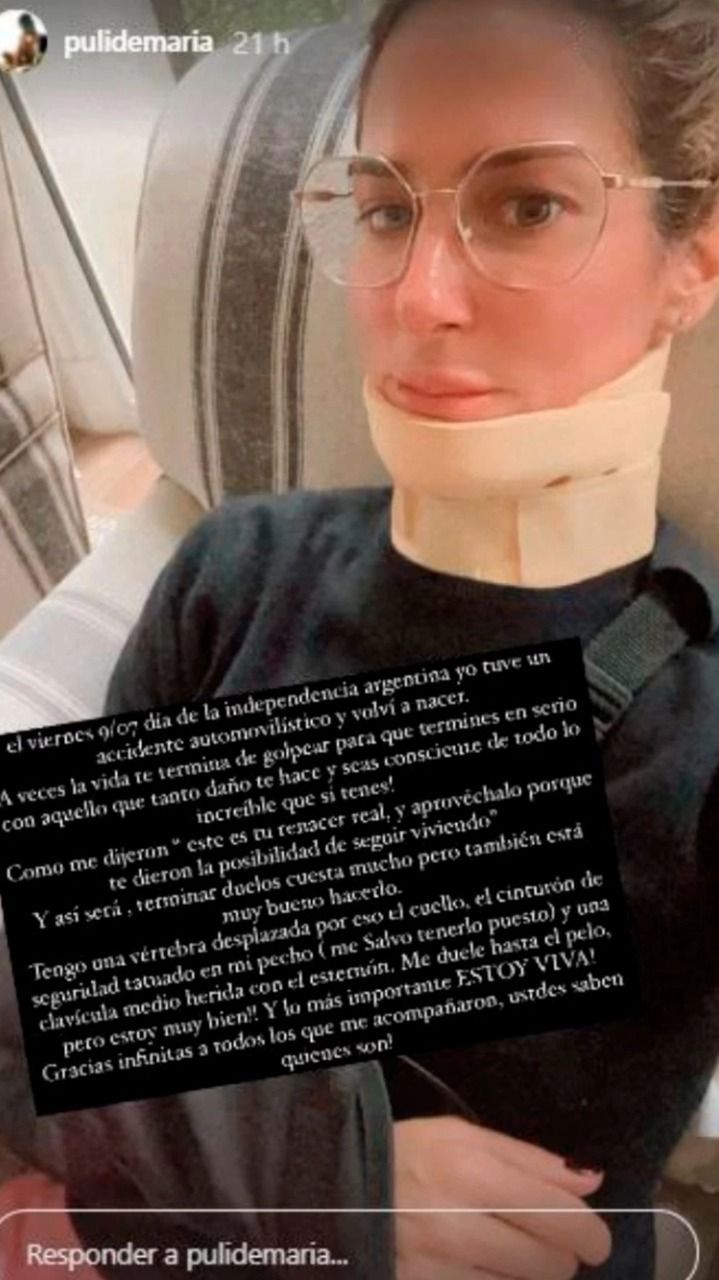 Con un cuello ortopédico y un camastro que sostiene su brazo, Puli Demaría comentó a través de una publicación en su cuenta de Instagram: "El día de la independencia, el 9 de julio, tuve un accidente automovilístico y volví a nacer. A veces, la vida te golpea para que termines de verdad con eso que tanto daño te hace y seas consciente de todo lo increíble que sí tenés", comentó la DJ.