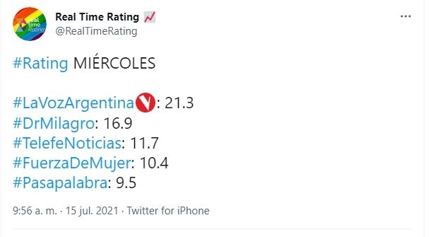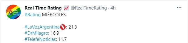 En este sentido, el reality de canto que conduce Marley fue lo más visto de la televisión local con 21.3 puntos. Le siguieron Doctor milagro con 16.9 y Telefe Noticias con 11.7 puntos de rating.