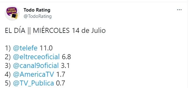 En referencia a los canales, el top cinco de los más vistos quedó de la siguiente manera: Telefe (11.0), El Trece (6.8), El Nueve (3.1), América (1.7) y Tv Pública (0.7).