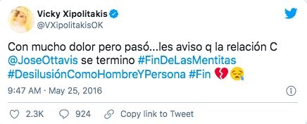 El exdiputado kirchnerista y la modelo se pasearon por muchos programas hablando de su amor, hasta que la relación llegó a su fin el 25 de mayo de 2016 con un tuit que tenía un insólito error que desató una ola de memes: la griega escribió "fin de las mentitas" en vez de "fin de las mentiras".