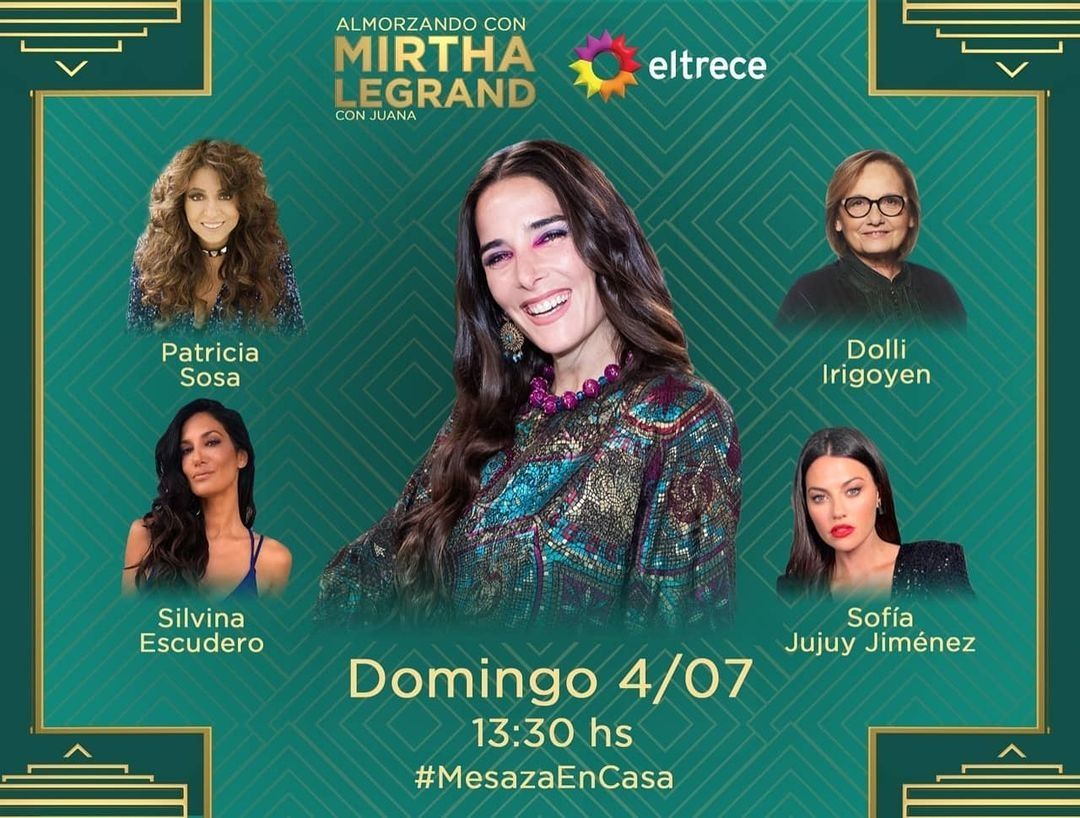 Por su parte, el domingo 4 de julio Juana tendrá una mesa cargada de figuras del mundo del espectáculo en Almorzando con Mirtha Legrand. La lista de invitados está compuesta por la cantante Patricia Sosa; la reconocida chef Dolly Irigoyen; la bailarina y actual integrante de Los Mammones, Silvina Escudero; y la participante de La Academia de ShowMatch Sofía "Jujuy" Jiménez, que vive por estas horas un fractura de costilla que podría dejarla fuera de concurso.