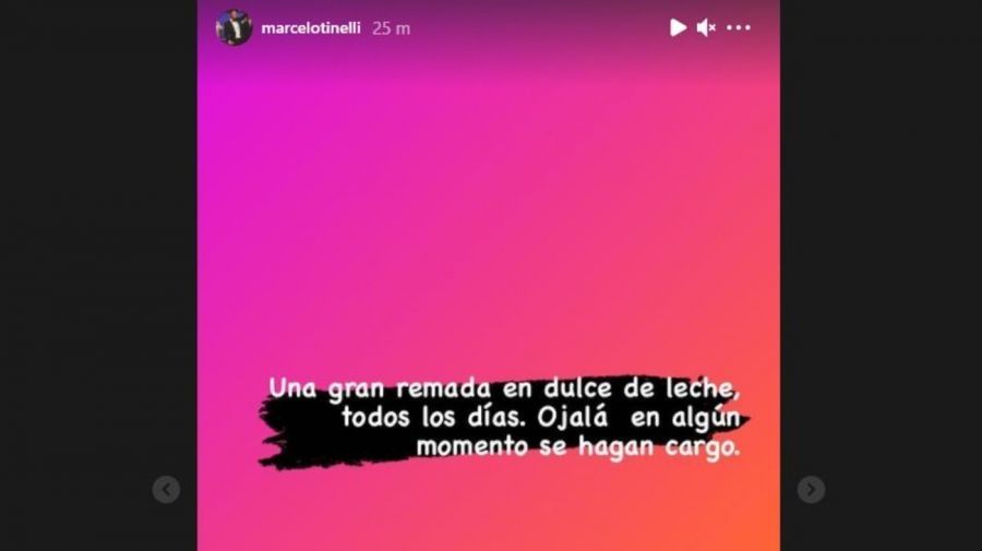 El mensaje de Tinelli que había levantado controversia el miércoles decía: "Una gran remada en dulce de leche, todos los días. Ojalá en algún momento se hagan cargo". El posteo lo hizo al empezar la emisión de La Academia, por lo cual muchos interpretaron que se refería al bajo piso de rating que le deja Telenoche (El Trece), el noticiero conducido por Luciana Geuna y Diego Leuco.