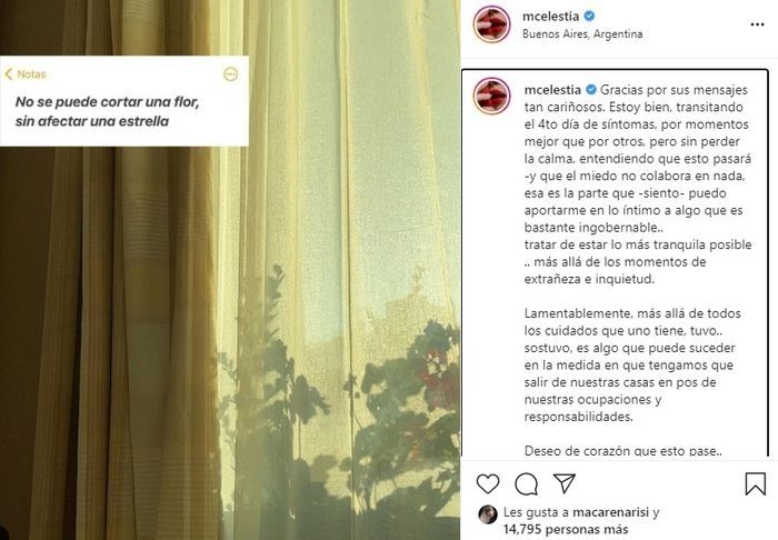 Y Celeste concluyó: "Deseo de corazón que esto pase.. que la gente que lo está transitando feo pueda sentirse mejor pronto, y que nos sigamos cuidando. Nos vacunemos, por nosotros y por los otros. Somos en red, cómo escribía el otro día... Si había alguna duda de eso, esta pandemia finalmente nos lo demostró en la cara. Me gusta esta frase (no recuerdo de quien era) que pegué en la foto, .. parece llena de poesía pero tanto tiene de realidad. Somos responsables de cuidarnos y cuidar lo que nos rodea. Ojalá la humanidad como especie sea cada vez más ‘humana’, lo individual es colectivo. Nos abrazo. Cel".