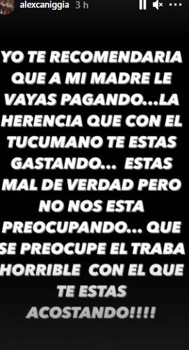 "Yo te recomiendo que a mi madre le vayas pagando la herencia que con el tucumano te estás gastando", disparó el Emperador desde su cuenta de Instagram. "Estás mal de verdad pero no nos está preocupando... que se preocupe el traba horrible con el que te estás acostando", sentenció en relación a la actual pareja de su padre, Sofía Bonelli.