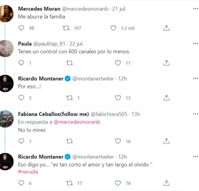 Pero en las últimas horas apareció un mensaje muy particular que sorprendió a todos. Y Montaner decidió no dejar pasar en alto. "Me aburre la familia", escribió Mercedes Morán en referencia a los Montaner, en su cuenta oficial de Twitter. "Tenés un control con 600 canales", le respondió una usuaria. "Por eso...", agregó Ricardo. Otra mujer le dijo a la actriz: "No lo mires". Y el artista recordó una frase de Neruda: "Eso digo yo.... es tan corto el amor y tan largo el olvido".