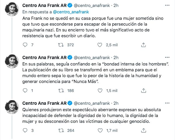 Pero en las últimas horas, quien respondió de manera contundente fue el representante de la Anne Frank House en Argentina, Héctor Shalom. A través de la cuenta del Centro Ana Frank en Twitter, manifestaron: "Usar la imagen de Ana Frank como fondo de una canción de una mujer que se rehúsa a quedarse en la casa es llevar la banalización del Holocausto hasta su expresión más extrema. Es un acto de humillación a las millones de víctimas, a los sobrevivientes y a toda persona que elija la dignidad humana como opción de vida", comienza el texto.