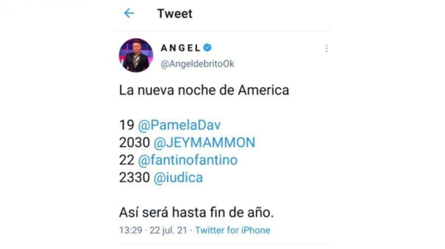 Según confirmó Ángel de Brito en su cuenta de Twitter, Intrusos volverá a tener solamente su clásica emisión de las tardes y ya no la que se sumó cerca de la medianoche. Por otro lado, ya está cerrada la vuelta de Pamela David al canal América. En términos de cambio de horario, el ciclo que tendrá una drástica modificiación es Polémica en el bar que pasará de las 19 a las 23:30.