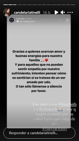 "Gracias a quienes acercan amor y buenas energías para nuestra familia. Y para aquellos que no puedan sentir empatía por nuestro sufrimiento; intenten pensar cómo se sentirían si se tratase de un ser amado por ustedes. O tan sólo llámense a silencio por favor", disparó Gonzalo "Bambi" Moreno Charpentier.