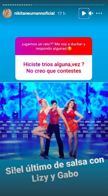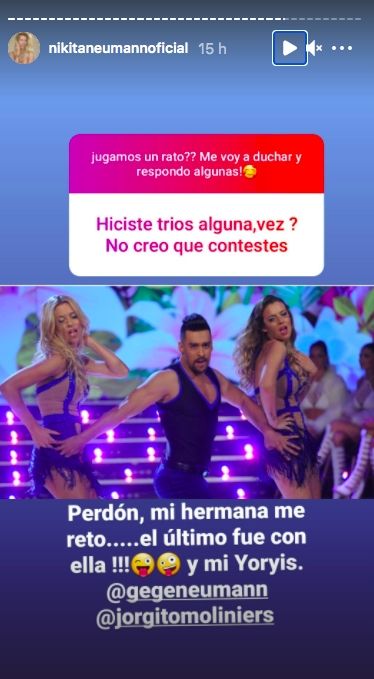 Sin embargo, cuando parecía que el tema ya estaba saldado, Nicole retomó la pregunta para hacer una salvedad: "Perdón, pero mi hermana me retó ¡El último fue con ella!", junto a un guiño y una foto de la performance que, en 2016, compartió con Geraldine Neumann y Jorge Moliniers, también en el programa de Marcelo Tinelli.