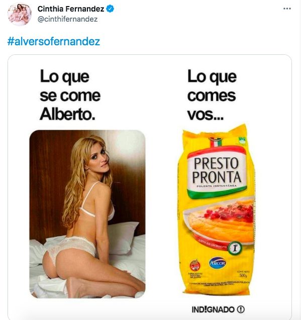 A partir de las conjeturas y repercusiones de la noticia, la panelista de Los Ángeles de la Mañana aprovechó para pegarle al presidente Alberto Fernández al compartir en sus redes sociales un collage de dos fotos: una de Pacci y otra de un paquete de polenta. Las imágenes fueron acompañadas de los textos: "Lo que se come Alberto" y "Lo que comés vos".