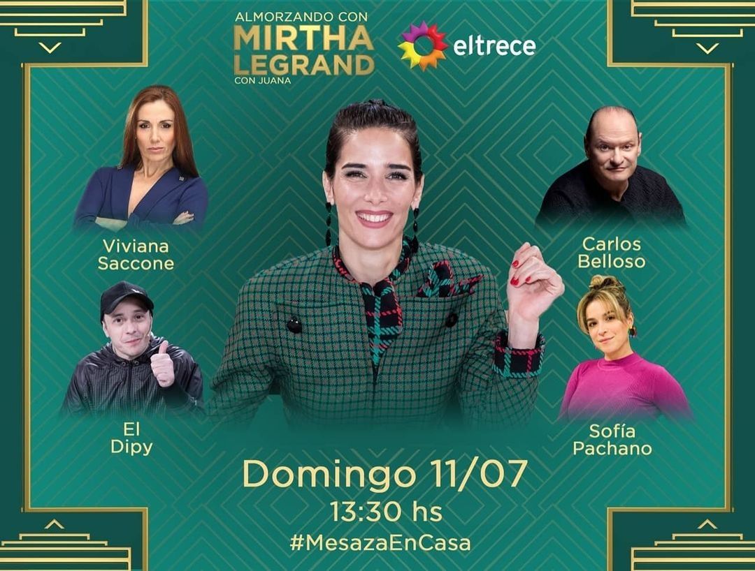 Por su parte, el domingo 11 de julio en Almorzando con Mirtha Legrand, Juanita será acompañada por grandes artistas como la actriz Viviana Saccone, quien actualmente participa del certamen La Academia de Showmatch; el actor Carlos Belloso quien confirmó hace poco su participación en la miniserie sobre el caso García Belsunce; la bailarina Sofía Pachano quien este año se sumó a la conducción de Cocineros Argentinos; y el cantante de cumbia El Dipy, quien hablará de la política actual y sus recientes dichos.