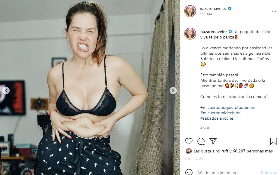 Nazarena Vélez decidió publicar varias fotos en su cuenta de Instagram, mostrando su cuerpo al natural y problematizar sobre los desórdenes alimenticios. "Un poquito de calor y ya te pelo panza. Lo que vengo morfando por ansiedad las últimas dos semanas es algo increíble. Bahhh, en realidad los últimos dos años... Esto también pasará. Mientras tanto, a decir verdad, no la paso tan mal", comentó la productora teatral.