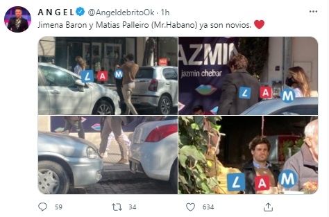 Ángel de Brito fue quien subió una serie de instantáneas a su cuenta de Twitter y la dejó en evidencia. Junto a las fotografías, donde se los ve caminando por las calles porteñas, el conductor de LAM afirmó: "Jimena Baron y Matias Palleiro (Mr.Habano) ya son novios".