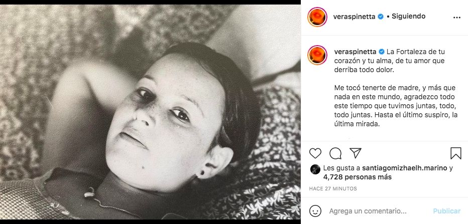 Fue una de sus hijas, Vera Spinetta, quien compartió un emotivo posteo en sus redes sociales. "La Fortaleza de tu corazón y tu alma, de tu amor que derriba todo dolor", escribió hace instantes en su cuenta de Instagram junto con una foto de su madre de joven. "Me tocó tenerte de madre, y más que nada en este mundo, agradezco todo este tiempo que tuvimos juntas, todo, todo juntas. Hasta el último suspiro, la última mirada", agregó.