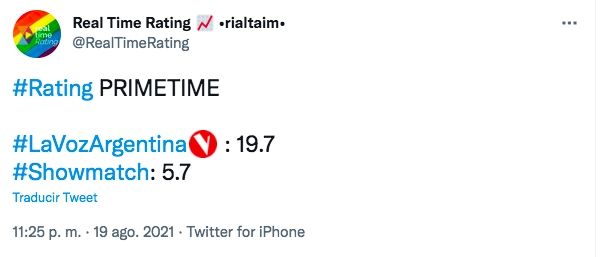 La Voz Argentina volvió a ser el programa más visto del día en la televisión argentina. Este jueves 19 logró superar la barrera de los 20 puntos de rating, consolidando su liderazgo en el prime time con un pico máximo de 21.7. Showmatch, su principal competidor, logró un leve repunte pero no le alcanzó para acercarse al reality de Telefe. El mayor pico de audiencia del programa conducido por Marcelo Tinelli rondó los 10,7 puntos. Pero la gran diferencia sigue estando en el cierre. El ciclo de El Trece finalizó con 5.7 puntos, mientras que el certamen de canto marcaba 19.7 puntos.