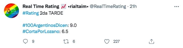 La tarde fue para Dulce ambición que llegó a 9,3, seguido por 100 argentinos dicen que marcó una máxima de 9. Luego se ubicó Cortá por Lozano con 6.5, El club de las divorciadas con una marca máxima de 5,9 puntos. Super Super obtuvo pico de 3,5 puntos, y A la tarde llegó a los 2.5 puntos.