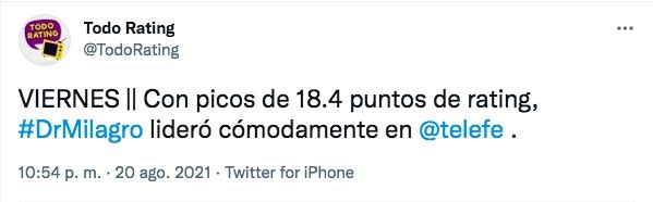 Fue la novela turca Doctor Milagro quien se adjudicó la mayor audiencia del viernes, logrando 18.4 puntos por la pantalla de Telefe. De esta forma, el horario estelar de la televisión abierta argentina sigue siendo de Telefe. El canal de las pelotas continúa dando pasos firmes en relación a la competencia por el rating con su principal competidor, El Trece.