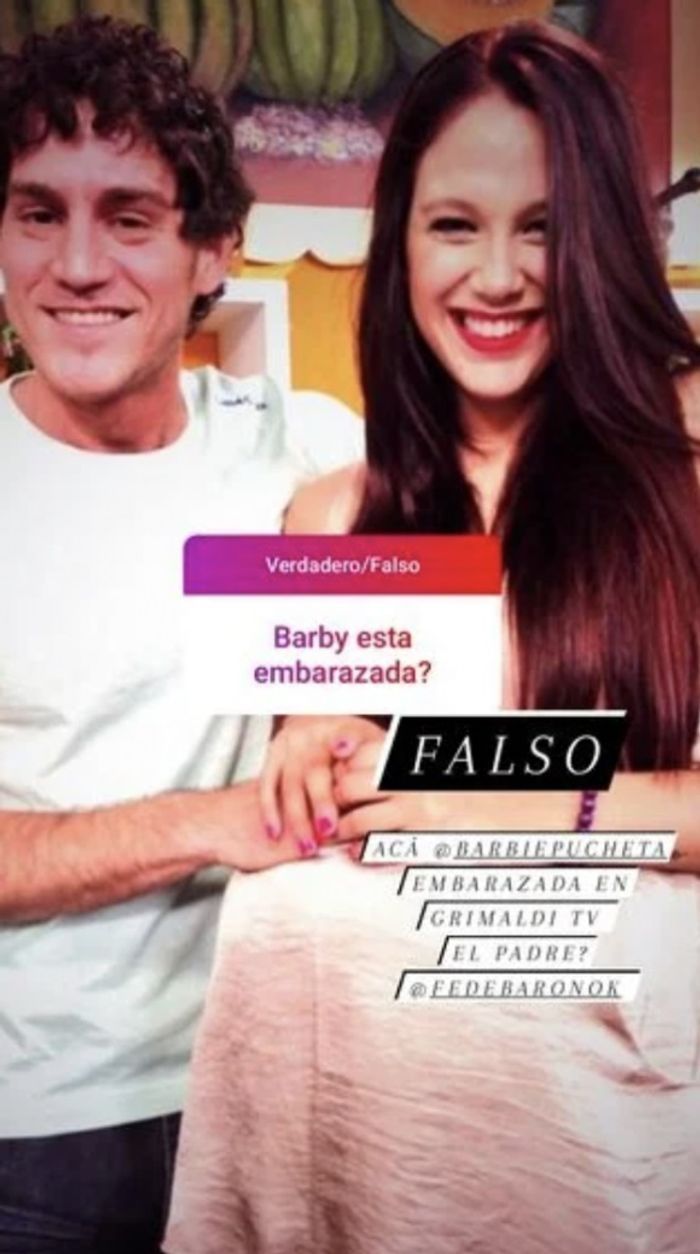 "¿Barby está embarazada?", le consultaron sobre la joven que dentro de poco se casará con su novio, Lucas Rodríguez. Entonces, su madre optó por jugar con una foto retro de su hija interpretando a una mujer embarazada en la obra teatral Los Grimaldi. "FALSO", expresó en el texto de la foto Nazarena Vélez.