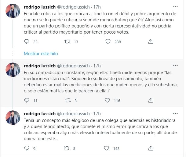 Tras las repercusiones de sus dichos, el que levantó el guante fue Rodrigo Lussich. El conductor de Intrusos salió al cruce de la histórica integrante del equipo de Marcelo. "¿Marcela Feudale critica a los que critican a Marcelo Tinelli con el débil y pobre argumento de que no se lo puede criticar si se mide menos rating que él?", empezó disparando en su cuenta de Twitter. Luego, continuó: "Algo así como que un partido político pequeño y con cierta representatividad no podría criticar al partido mayoritario por tener pocos votos", comentó.