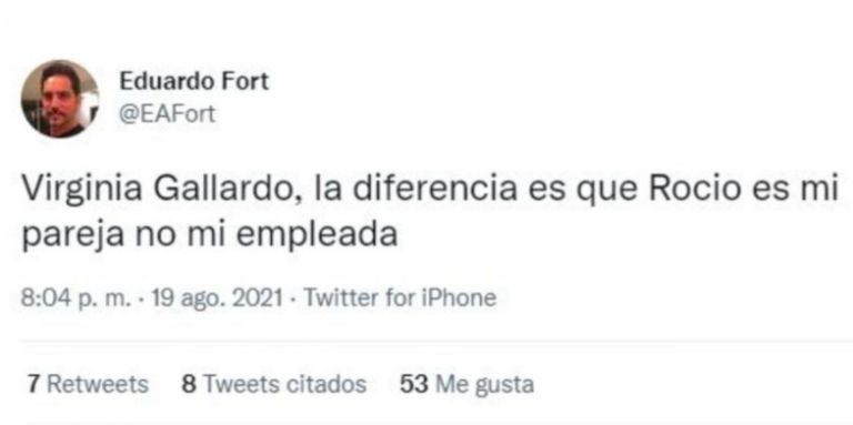 "La diferencia es que Rocío es mi pareja no mi empleada", había escrito en su cuenta de Twitter Eduardo, luego del fuerte enfrentamiento que protagonizaron Marengo y Gallardo. El comentario se refiere al rumor sobre la supuesta contratación del mediático a la bailarina para que hiciera el papel de novia frente a los medios.